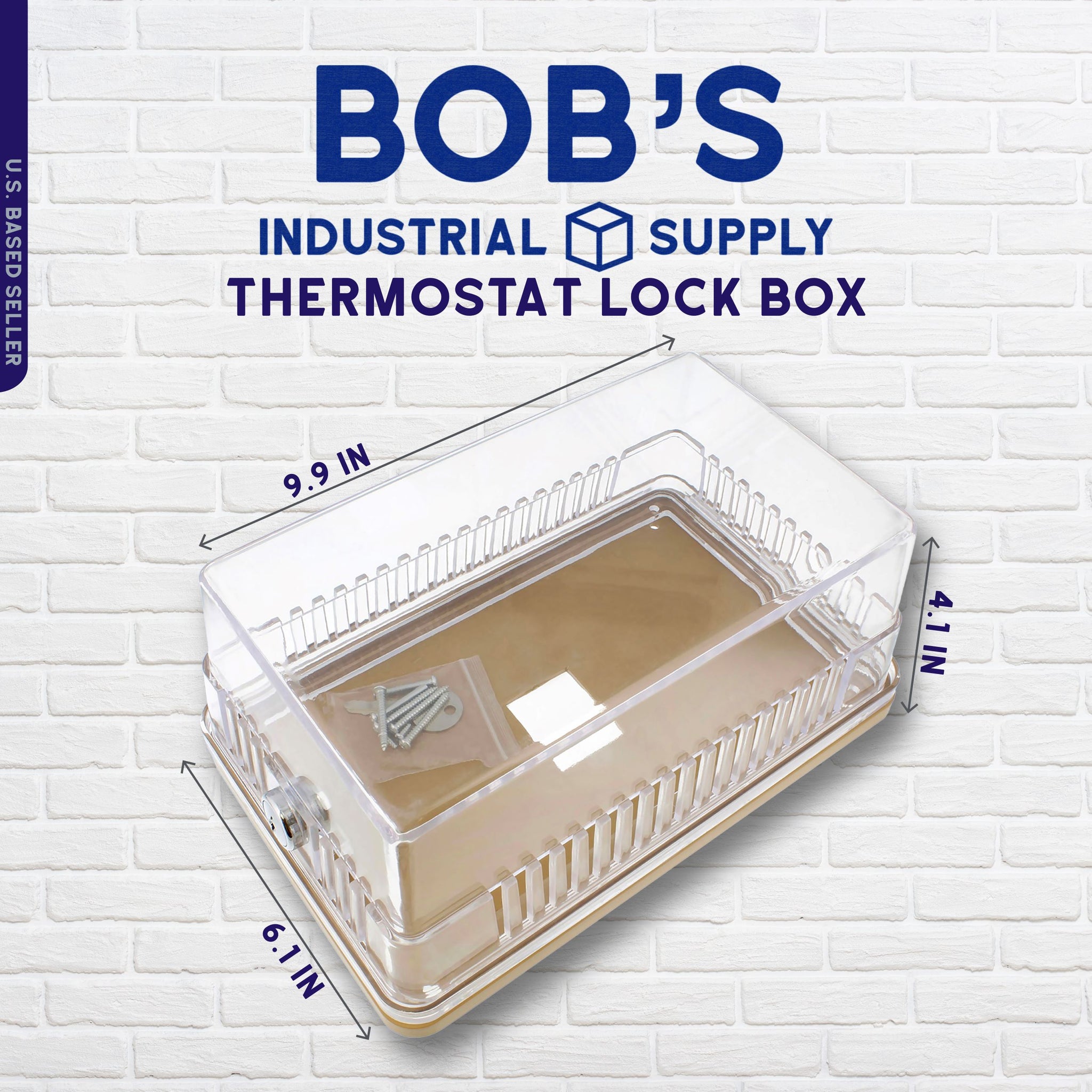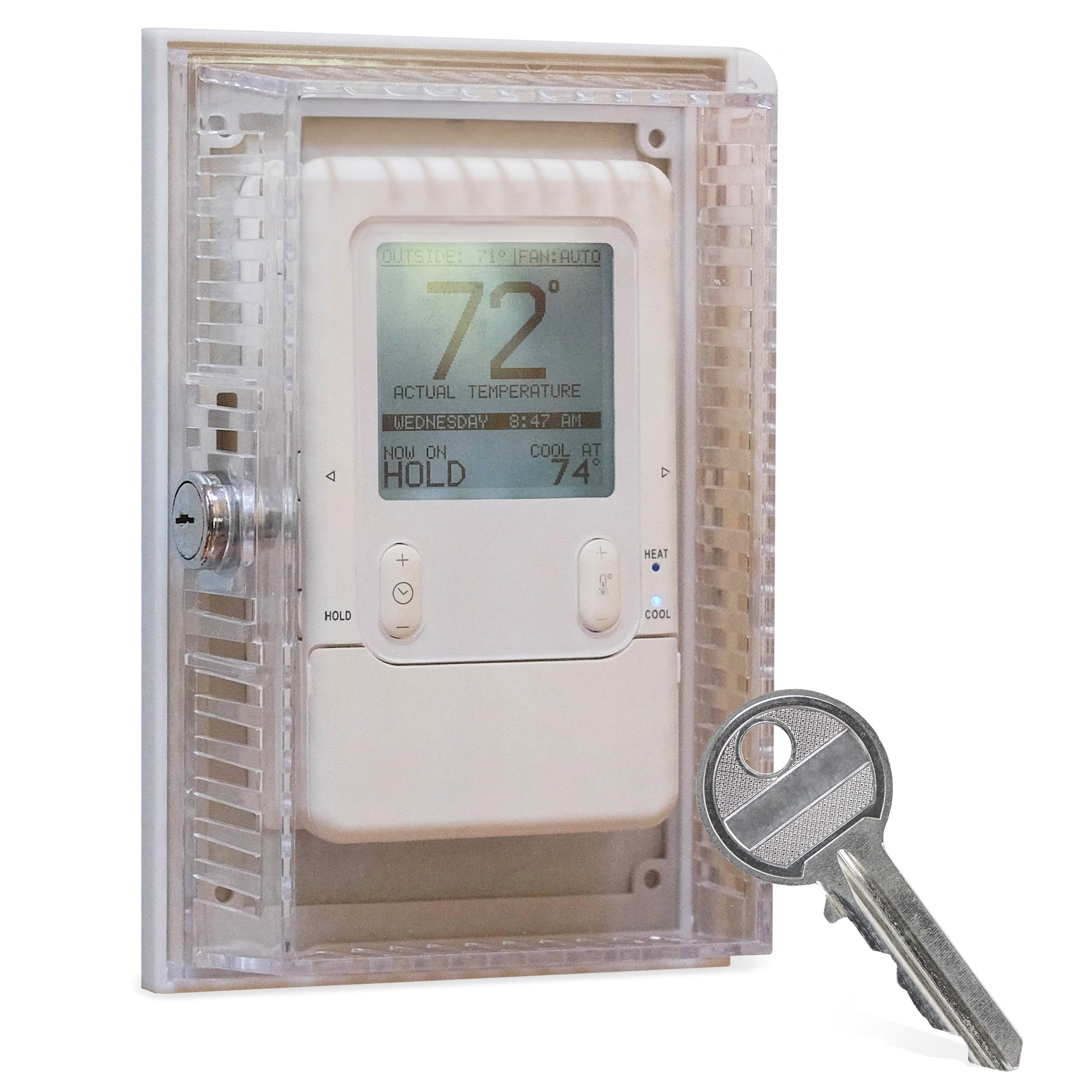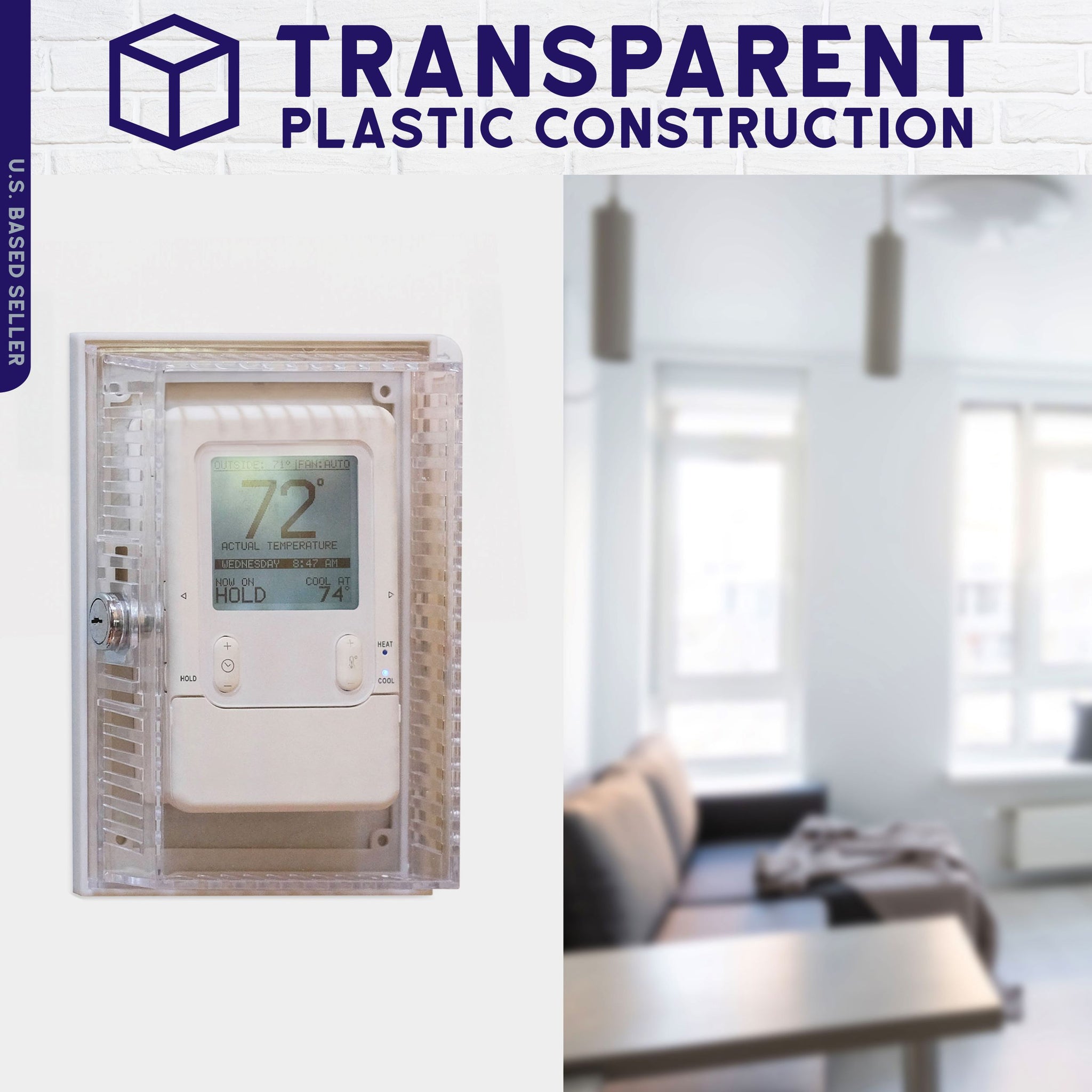 [Decrease Energy Bills]: The BISupply Thermostat Cover Lock is a clear lock for air condition and heat control; Transparent plastic to clearly see your unit while preventing tampering [Fit Your Thermostat]: Measure long side of your thermostat including temperature setting levers and add 1in (2.54cm) to determine correct fit [Temperature Stability]: Thermostat box cover with lock is ventilated on all 4 sides to avoid interference with detection of current temperature [Easy to Install]: Mount the opaque backplate to the wall, then thermostat to backplate and fix lock cover frame with hinged cover over unit while attached to wall [Contents]: Includes 1 - thermostat lock cover with detachable base, 1 - key, and 4 - mounting screws; Phillips screwdriver not included
