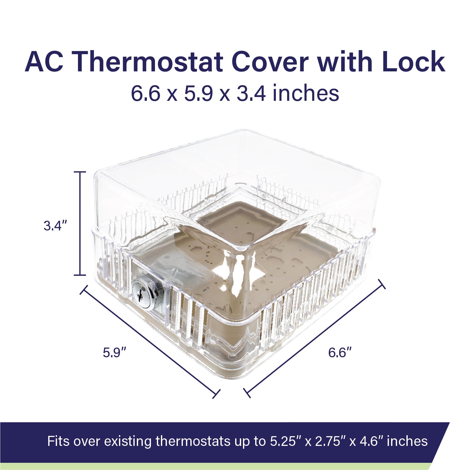[Decrease Energy Bills]: The BISupply Lockable Thermostat Guard is a clear lock for air condition and heat control. Transparent plastic to clearly see your unit while preventing anyone from tampering [Fit Your Thermostat]: 5.25 x 2.75 x 4.6 inch (13.3 x 7 x 11.7cm) internal dimensions with 2 x 1.5 inch (5.1 x 3.8cm) backplate wire hole; Measure your thermostat height including temperature setting levers and add one inch [Temperature Stability]: AC lock box with key is ventilated on all 4 sides to avoid interference with detection of current temperature; 6.6 x 5.9 x 3.4 inch (16.8 x 15 x 8.6cm) outside dimensions [Easy to Install]: Opaque backplate mounts to wall, your thermostat mounts on backplate, and cover locks over backplate; Open hinge allows install without removing thermostat from wall, just install clear cover [Contents]: 1 thermostat lock cover with detachable base, 1 key, and 8 mounting screws; Phillips screwdriver not included