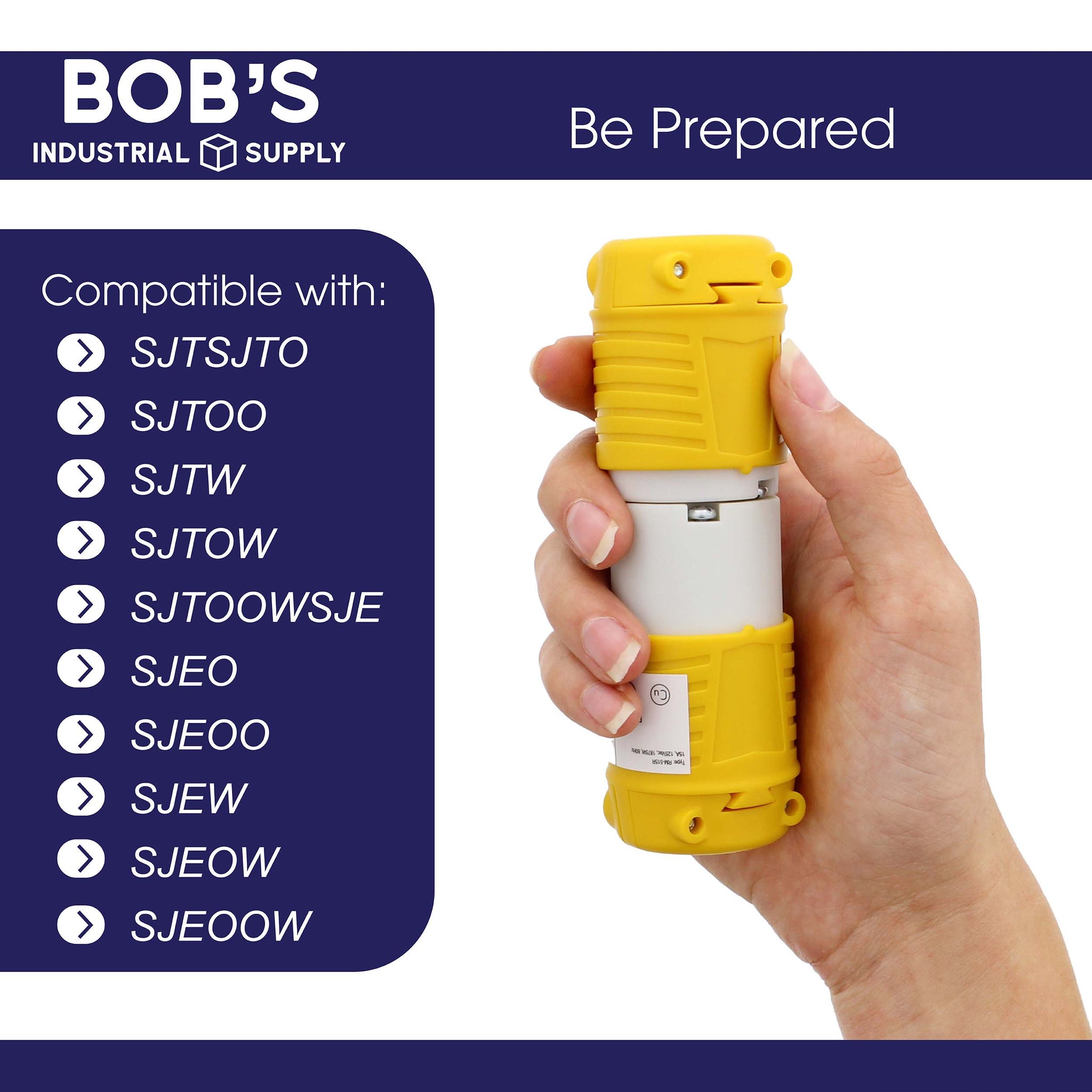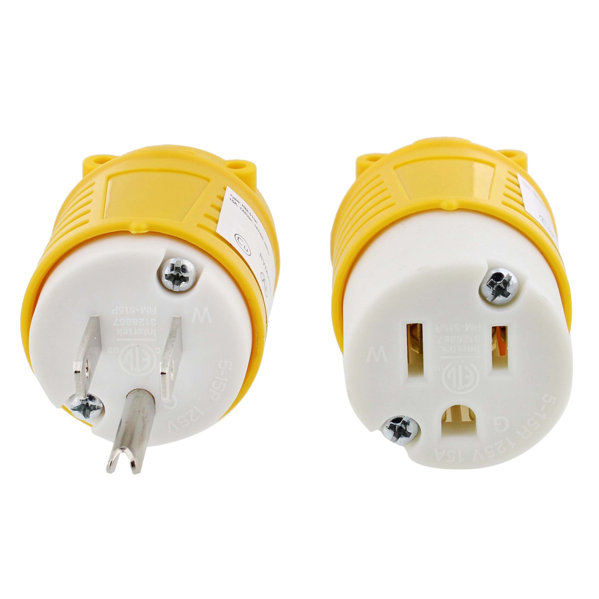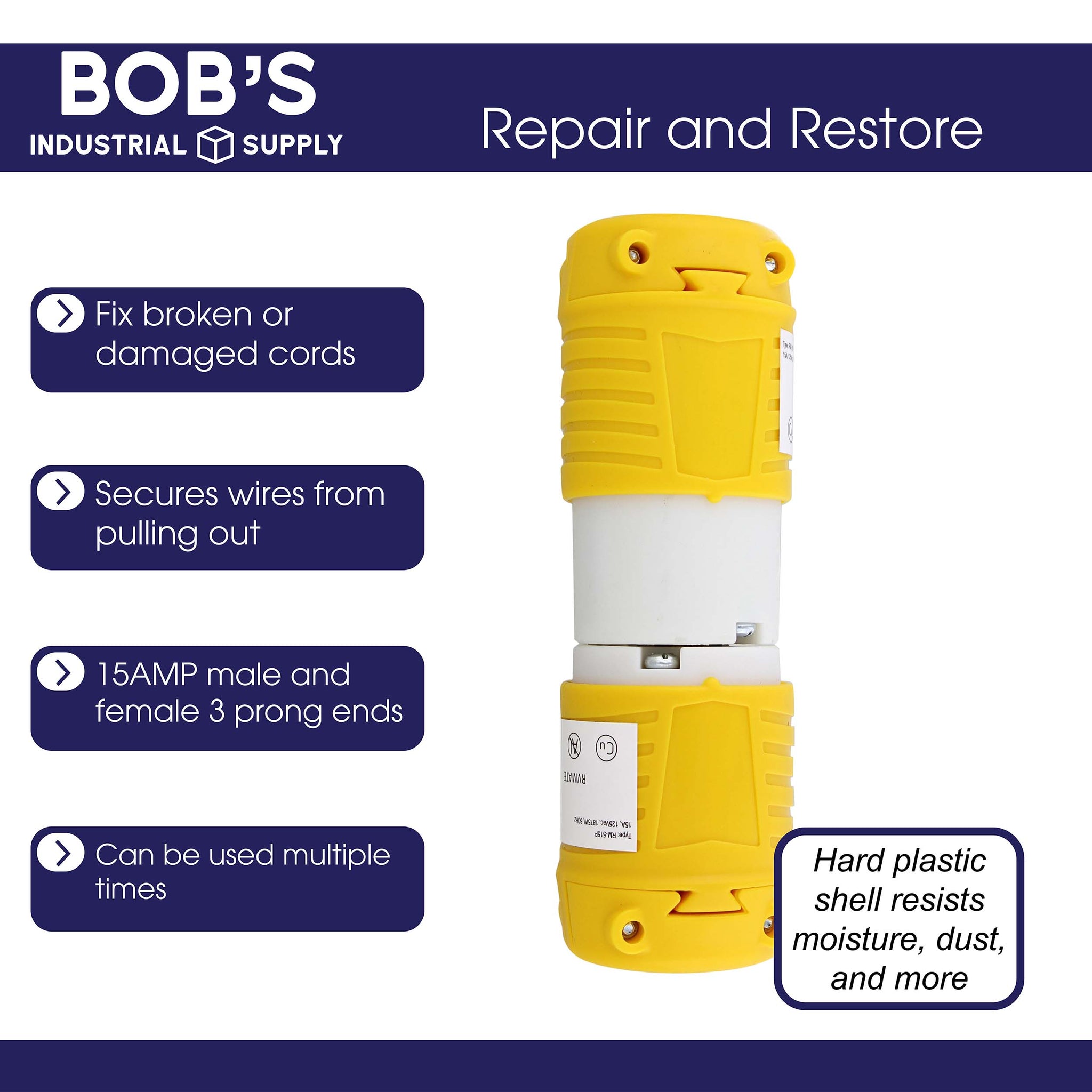 [Fix Cords]: Fix broken or damaged cords with the BISupply Replacement Electrical Plug Cords; Use the electric cord replacement grounding plug in the garage, office, and to fix most household appliances; Replace broken wire created by a damaged cable sheath, animal bites, or a broken cable connection [Repair and Restore]: Compatible with varying wire sizes including SJTSJTO, SJTOO, SJTW, SJTOW, SJTOOWSJE, SJEO, SJEOO, SJEW, SJEOW, SJEOOW suitable for making new power cables, or repairing extension cords [Keep Your Home Safe]: Constructed of copper parts, the electric repair plug set secures wires from pulling out; Hard plastic shell resists moisture, dust, and wear and tear; 15AMP male and female 3 prong plug ends repair abrasion on cords that if not treated could cause a fire or electrical shock [Be Prepared]: Easy to install plug repair set can be used multiple times; Connector and plug pieces come attached for spare electrical cord ends in an emergency [Package Details]: Package includes 5 yellow electrical cord plug replacement ends; Plug measures 2.8 inches (7cm) long and the connector is 2.7 inches (6.9cm) long; Instructions included for easy installation
