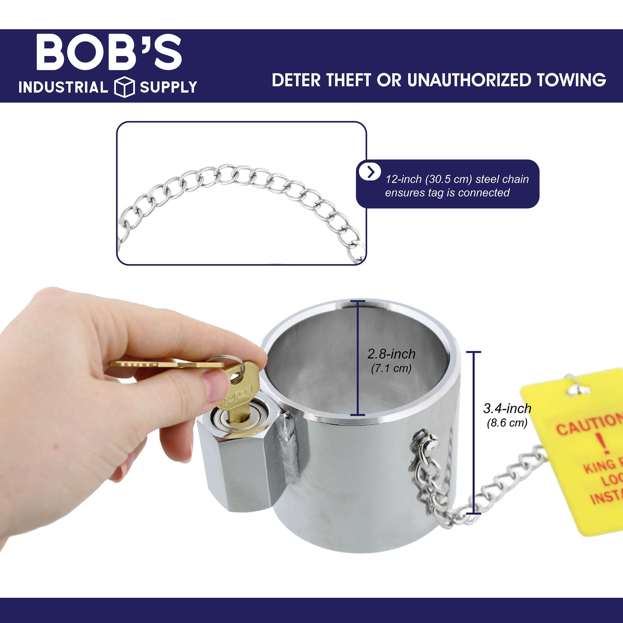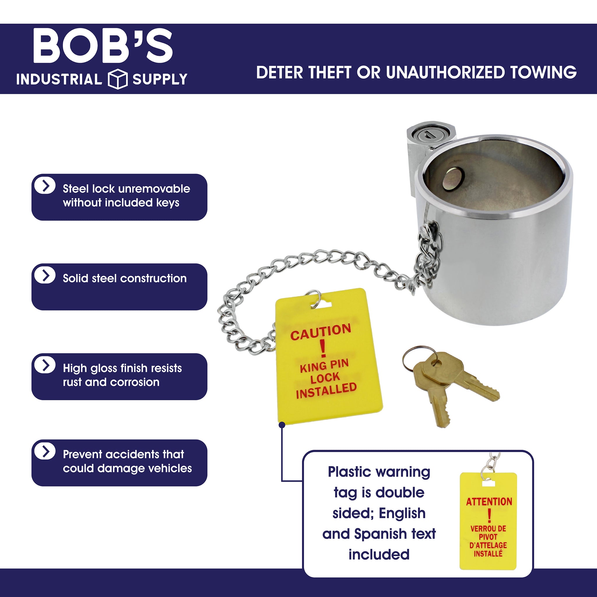 [Deter Theft]: Protect your RV and utility trailers from robbery or unauthorized towing with the BISupply Semi Trailer Kingpin Lock and Safety Tag; Steel lock cannot be removed without included kingpin lock fifth wheel keys [Heavy-Duty Steel Construction]: Solid steel cuff has a 2.8-inch (7.1 cm) inner diameter and a 3.4-inch (8.6 cm) outer diameter for durability and strength; High gloss finish resists rust and corrosion caused by elements [Easy to Use]: Slide cuff onto hitch and engage the fifth wheel kingpin lock using the included keys; Lock cylinder slides inwards to ensure a sturdy, tamper-resistant connection that protects your trailer from being towed away [Fluorescent Tag]: Extra visual warning helps prevent accidents that could damage your vehicle while your RV king pin lock is engaged; 12-inch (30.5 cm) steel chain ensures your tag will stay connected to your 5th wheel trailer hitch lock [Package Contents]: RV fifth wheel hitch lock set includes a 3-inch (7.6 cm) tall king pin hitch lock with slide bolt pin, 2 keys, and a plastic warning tag; Ideal for truck companies, RV dealers, and fleet drivers